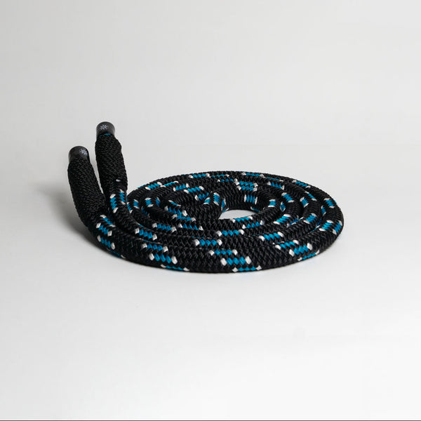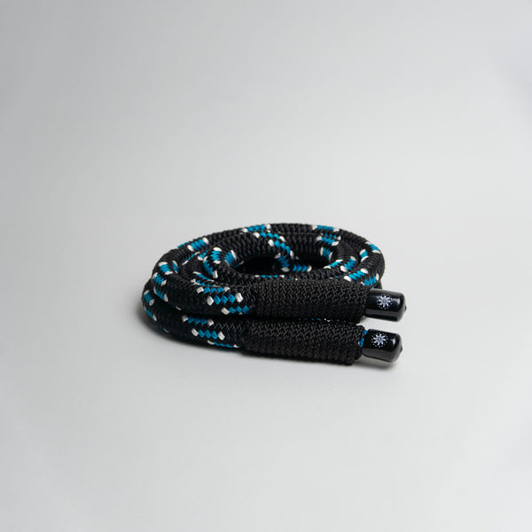 The rope has a black construction with white and blue inserts.